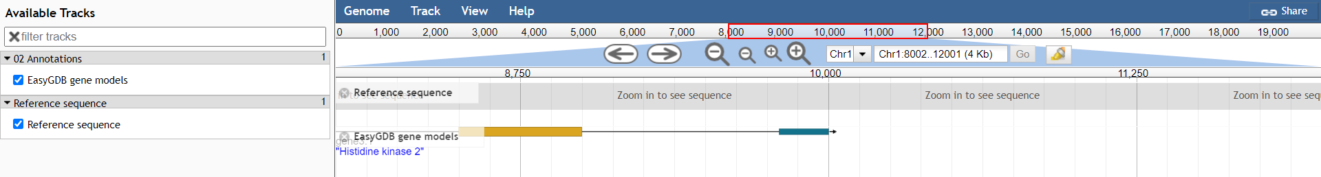 JBrowse is an external app to IHSM Subtropical DB. Because of that, it appears an emergent window with the advice of cookies policy (Figure 1). Clicking in OK it will redirect to the JBrowse page, it will open in a new tab. Once inside, the user can browse in the genoma chosen with the different tracks available, zoom in the genome or search a specific gene (with de dropdown or autocomplete search bar) (Figure 2). More information can be consulted in