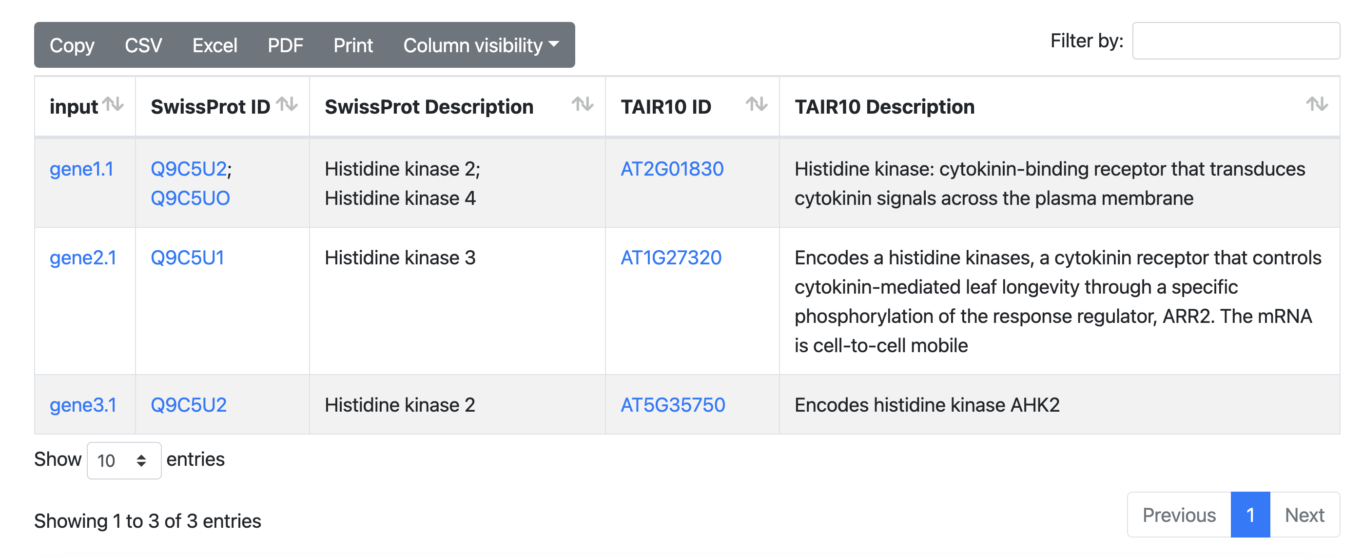 The main page of the annotation extraction (Figure 1) allows the user to search a list of genes identifiers (IDs) and obtain the annotations from different databases (SwissProt, Araport11, TrEMBL and InterPro). Multiple gene ID can be pasted into the box. Clicking on Search button, it will get the outputs. Then, the user can access to an input clicking on the database ID (Figure 2), it will redirect to the database page (in a new tab) to get more information. The output results can be copied to the clipboard, downloaded in several formats (CVS, Excel or PDF) and printed. The user can configurate, in the Column visibility dropdown, which database appears.